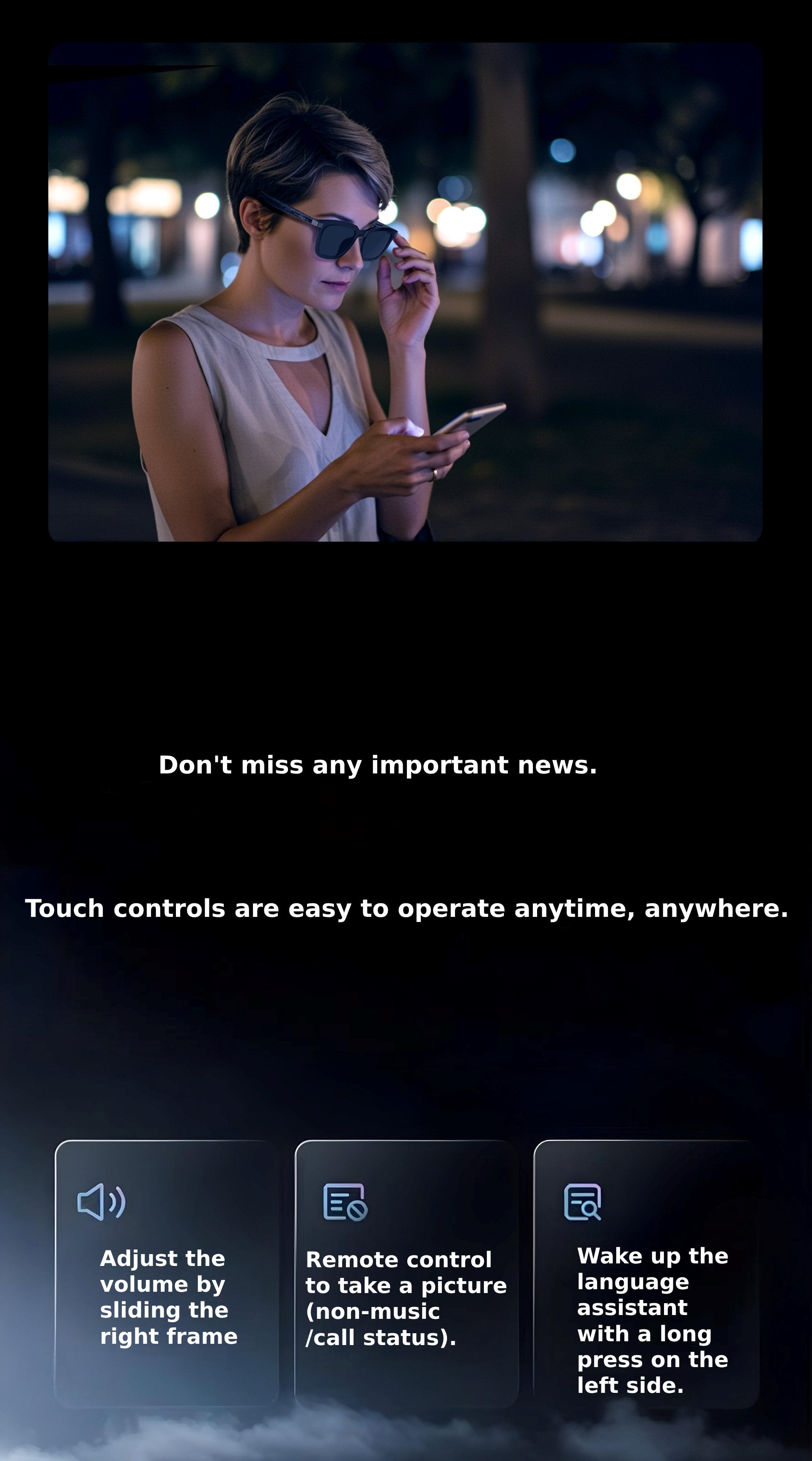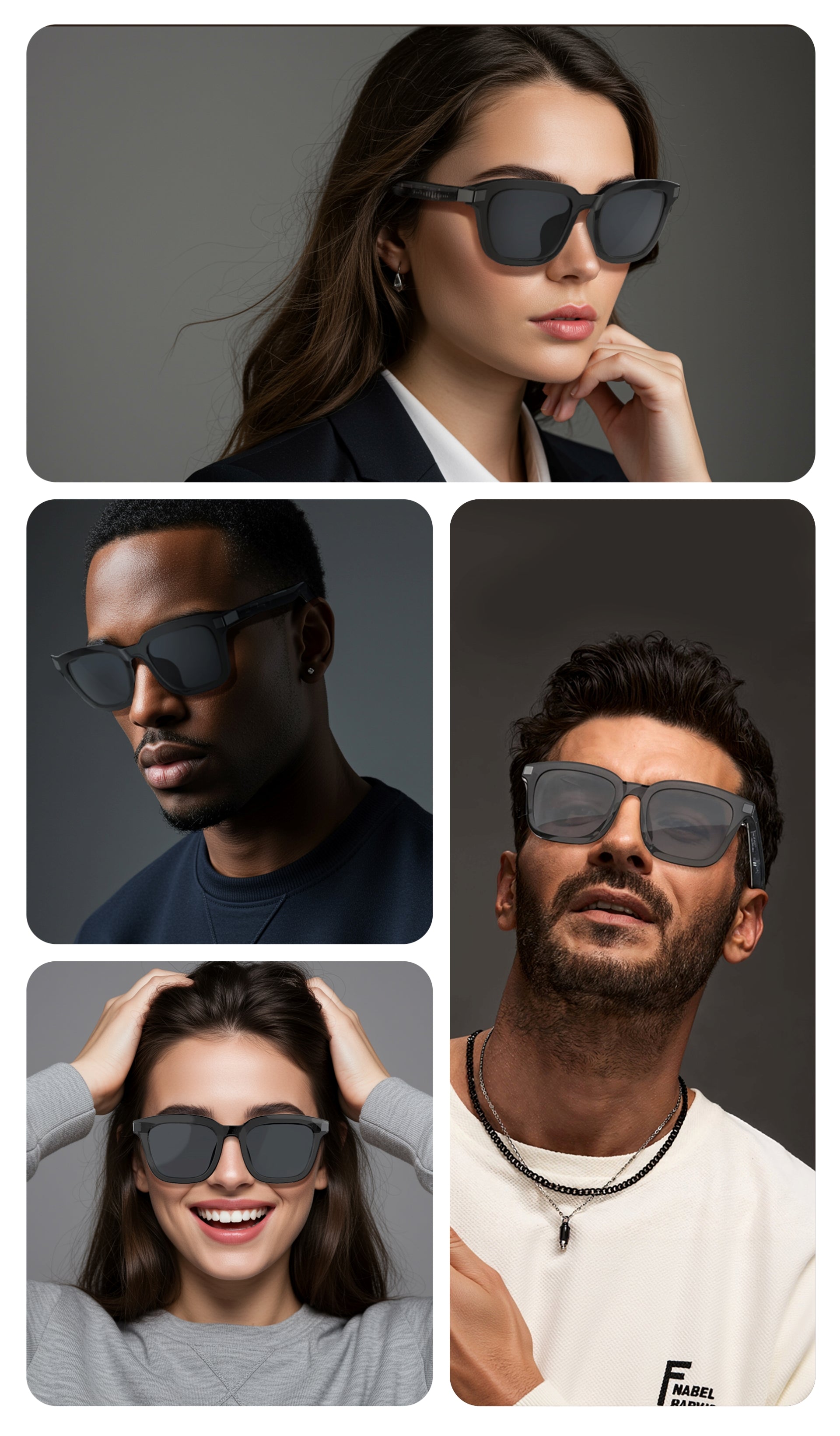 Say goodbye to traditional headphones and embrace a new way of listening. These Bluetooth audio sunglasses combine stylish design with advanced sound technology, allowing you to play music anytime without the need for earbuds. Featuring an ultra-lightweight build and long battery life, they provide all-day comfort without compromise. The interchangeable lenses adapt to different environments, while the IPX water-resistant rating ensures durability against sweat and light rain. Whether you're driving, cycling, running, or commuting, these smart sunglasses deliver high-quality audio, keeping you connected to your world—hands-free and hassle-free.